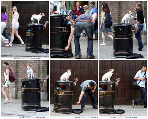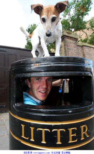 中新網(wǎng)7月8日電 據(jù)臺灣“今日新聞網(wǎng)”7日報道,英國一位知名的街頭藝人查理卡維(Charlie Cavey)總是躲在垃圾桶里自彈自唱。但這種表演方式行動不便,賞金時常被偷走或搶走,于是最近找來一只杰克羅素犬“歐比”(Obi)幫他把風。歐比乖巧的模樣,令人聯(lián)想到在唱片上有超過100年歷史的知名LOGO。