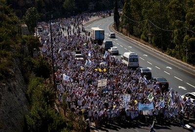 昨天參加活動(dòng)的人數(shù)達(dá)到12天來,在以色列全境舉行的釋放沙利特的請?jiān)富顒?dòng)的最高點(diǎn)。