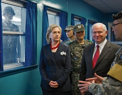 美國媒體報道稱,當(dāng)希拉里和蓋茨走進軍事停戰(zhàn)委員會樓時,對面一方的朝鮮士兵立即透過窗戶,對兩人怒目而視。