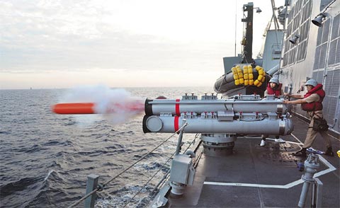 韓國產(chǎn)輕魚雷“青鯊”可貫穿1.5米厚的鋼板,追蹤2公里外潛艇的聲波信號并加以擊毀!扒圊彙敝睆32厘米、長2.7米、重280公斤。魚雷誘餌系統(tǒng)是擾亂魚雷制導(dǎo)的裝備,能夠利用偽裝的螺旋槳噪音等引誘魚雷攻擊。