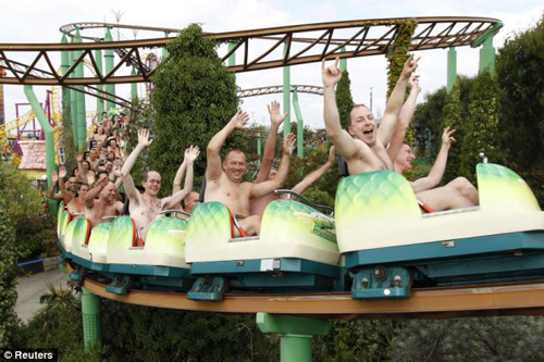 中新網(wǎng)8月9日電 據(jù)英國(guó)媒體報(bào)道,當(dāng)?shù)貢r(shí)間8月8日,102名英國(guó)男女齊聚艾塞克斯郡冒險(xiǎn)島游樂(lè)園,將衣服全部脫掉,體驗(yàn)裸體乘坐“綠色尖叫”過(guò)山車(chē)的刺激感覺(jué)。這102人也創(chuàng)造了一項(xiàng)新的世界紀(jì)錄。