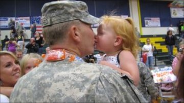 士兵杰森•艾夫舍德盡情享受著與妻子和孩子團(tuán)聚的溫情。他說,過去的1年真是無比漫長的1年。妻子考特尼則無法抑制住淚水,她說:“我覺得這是種解脫,不用每天擔(dān)心他的安全,他可以每天晚上回到家里。”
