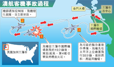 據(jù)報道,該架緊急降落的飛機為波音747-400客機,航班編號QF74,機上載著212名乘客和18名機組人員。飛機在當?shù)貢r間9月1日晚11時05分從舊金山起飛,但航行了15分鐘后,機上乘客忽然感到極不正常,來自飛機右邊的強烈震動,坐在右邊的乘客大吃一驚。飛機一下子猛烈左轉,有乘客赫然看到窗外有火焰噴出。機師不久后宣布客機需要緊急降落。