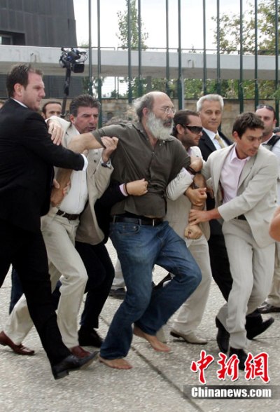 中新網(wǎng)9月12日電 據(jù)臺灣“中廣新聞網(wǎng)”11日報道,一名希臘男子因不滿希臘政府的經(jīng)濟緊縮政策,對希臘總理帕潘德里歐丟擲鞋子。