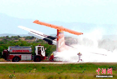 委內(nèi)瑞拉國(guó)家電視臺(tái)畫(huà)面顯示,飛機(jī)在一個(gè)垃圾場(chǎng)斷成兩截,機(jī)翼飛出幾米外。有當(dāng)?shù)毓賳T介紹,飛行員就在飛機(jī)出事前幾秒曾發(fā)出呼救信號(hào)。這名沒(méi)有透露姓名的官員表示,事故原因可能是因?yàn)轱w機(jī)失控。