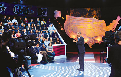 奧巴馬現(xiàn)身由“黑人娛樂電視”(BET)、“鄉(xiāng)村音樂電視”(CMT)和MTV電視臺(tái)主辦的直播節(jié)目,和年青人面對面談就業(yè)、移民和同性戀等問題。這些電視臺(tái)的主要收視群都是80、90后年青人。