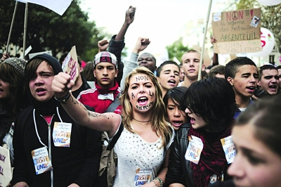 15日下午,全國300多所中學的學生開始罷課,加入到全國范圍的抗議中來。在巴黎等地區(qū),學生們情緒激動,并同維持秩序的警察發(fā)生沖突。防暴警察向?qū)W生投擲催淚彈,并拘捕了200多人。法國內(nèi)政部長霍特?怂购粲蹙胶褪就弑3挚酥,防止示威演變成騷亂。