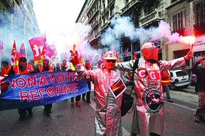 由于法國總統(tǒng)薩科齊執(zhí)意進行養(yǎng)老金改革,即準備將最低退休年齡由60歲延長至62歲,領(lǐng)取全額政府退休金的年齡則從65歲提高至67歲。這讓法國工會組織十分不滿。為了逼迫政府讓步,連日來,他們發(fā)動了數(shù)次罷工和示威游行。截至當?shù)貢r間16日,罷工潮已席卷法國大多數(shù)地區(qū)。