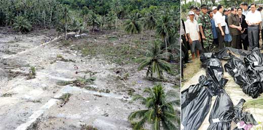 海底強震引起的致命海嘯發(fā)生兩天后,傷亡人數(shù)持續(xù)增加。最靠近震中、受創(chuàng)最深的明打威島煉,救難人員之前由于氣候惡劣無法登陸,裝載16噸的帳篷、藥品、食物和衣物的貨機,總算于27日下午抵達(dá)。由于挖墓的人力不足,仍可見到遺體散布在海邊及路邊。