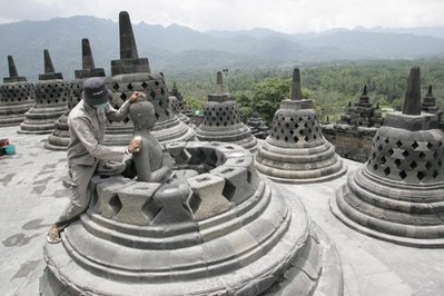 據(jù)報(bào)道,由于位于中爪哇省馬格朗縣日惹東北32公里的默拉皮火山26日開(kāi)始大規(guī)模噴發(fā),位于鄰近地區(qū)的婆羅浮屠佛塔也被大量火山灰覆蓋。當(dāng)局從當(dāng)日起就對(duì)景點(diǎn)實(shí)行限進(jìn)措施,并組織專人清掃覆蓋在佛塔建筑上的火山灰。
