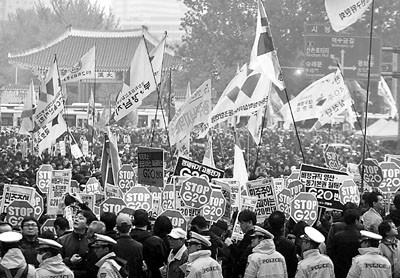 中新網(wǎng)11月8日電 韓國首爾將于本周四、五舉行20國集團(G20)峰會,當?shù)?日有4萬人在市政廳附近的首爾廣場示威,反對全球化及美韓自由貿(mào)易協(xié)定等,逾8000名防暴警察在場戒備。據(jù)香港《文匯報》報道,數(shù)百名群情洶涌的示威者嘗試游行到市中心,與防暴警察沖突,警方發(fā)射胡椒噴霧阻止人群前進。