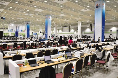 峰會(huì)會(huì)場(chǎng)COEX的新聞中心面積空前,主要分為電視和文字圖片記者兩個(gè)區(qū)域。工作人員表示,新聞中心設(shè)置1330個(gè)記者座位,另有132個(gè)電視轉(zhuǎn)播亭。