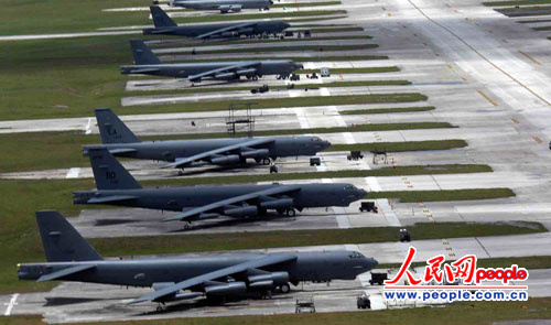 目前美海、空軍在關(guān)島部署了大量的先進(jìn)武器裝備。美空軍在關(guān)島組建了一個(gè)“全球打擊特遣隊(duì)”,包括6架B-2隱形轟炸機(jī)、12 架KC-135空中加油機(jī)、48架F-15E戰(zhàn)斗機(jī)和1架“全球鷹”無人偵察機(jī)。同時(shí),美國最先進(jìn)的隱形戰(zhàn)斗機(jī)“猛禽”F-22還定期飛往關(guān)島駐訓(xùn),且未來將永久部署關(guān)島。