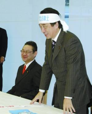在和長谷川市長交談前,菅直人頭上系了一條寫有“歸還北方四島”的頭巾,表達(dá)對此事的強(qiáng)硬態(tài)度。