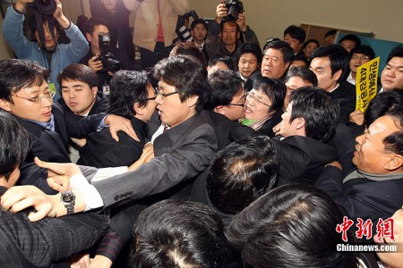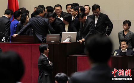 中新網(wǎng)12月8日電 據(jù)韓國(guó)媒體消息,韓國(guó)首爾國(guó)民議會(huì)大廳7日再次上演“全武行”,朝野議員爆發(fā)嚴(yán)重肢體沖突。