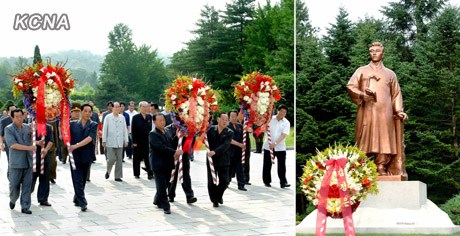 金正恩送來的花圈,擺放在金亨稷銅像和墳?zāi)骨。朝鮮勞動黨中央委員會政治局常委金永南、崔永林、崔龍海,以及朝鮮各級領(lǐng)導(dǎo)干部、人民軍官兵、群眾和青年學(xué)生參加敬獻花圈儀式。