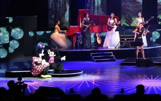 據(jù)報(bào)道,牡丹峰樂團(tuán)由金正恩親自組建,他觀看的這次演出包括美國(guó)迪士尼系列的歌舞劇。表演者打扮成米老鼠,小熊維尼等迪士尼知名卡通形象在舞臺(tái)上進(jìn)行表演,同時(shí)巨大背景屏幕上播放著“白雪公主”、“美女與野獸”等迪士尼電影片段。