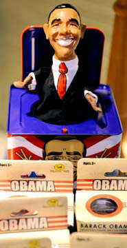 自當選總統(tǒng)的那一刻起,奧巴馬就成了商家的“搖錢樹”。隨著支持他的呼聲越來越高,各種以他為原型的商品層出不窮。T恤、籃球、棒球帽、戒指、鑰匙扣、筆、杯子應有盡有。在大街小巷,隨處可以看到和奧巴馬有關(guān)的小物品,諸如香煙、拳擊短褲、熱狗、高爾夫球、唇膏、腕表等,各色各樣,琳瑯滿目。