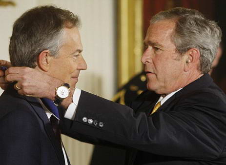 據(jù)英國《每日郵報》報道,美國總統(tǒng)布什13日向英國前首相布萊爾頒發(fā)了總統(tǒng)自由勛章。這一勛章是美國授予平民的最高榮譽(yù)。