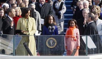 據(jù)美國媒體報道,美國最高法院首席法官約翰.羅伯茨20日為奧巴馬主持了就職宣誓儀式,領(lǐng)讀憲法中的35字誓詞。在宣讀第一句時,奧巴馬中間突然停了下來,因為他發(fā)現(xiàn)美國憲法中的誓詞應該是:“我將會忠誠地履行美國總統(tǒng)職務”,但羅伯茨在領(lǐng)讀時卻顛倒了“忠誠”一詞的順序。后來在國會山午餐宴會前,羅伯茨與奧巴馬握手并進行了短暫地交談,好象是告訴奧巴馬:“這是我的失誤!