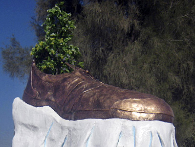 據(jù)香港東方日報即時新聞消息,巨鞋雕像豎立在被處決前伊拉克獨裁者薩達姆的家鄉(xiāng)提克里特,雕像種植了1株3米高的大樹,并坐落在1個白色的底座。