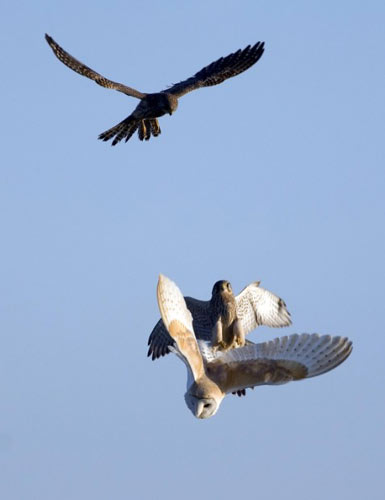 中新網(wǎng)2月6日電 據(jù)英國(guó)《每日郵報(bào)》5日?qǐng)?bào)道,攝影師近日拍攝到了猛禽“空戰(zhàn)”的精彩照片。照片中顯示,一直谷倉貓頭鷹在白天覓食時(shí)遭到兩只茶隼的伏擊。