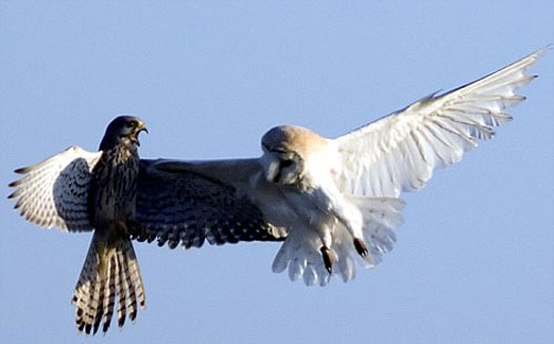 “能看到這一幕真的非常不可思議。谷倉貓頭鷹堅(jiān)持不懈的尋找野鼠一類的食物,但每次總會(huì)遭到茶隼的襲擊。” 據(jù)攝影師介紹:“它們?cè)诳罩姓归_激烈搏斗,最終貓頭鷹會(huì)選擇放棄,并丟下自己的獵物逃跑,但貓頭鷹還會(huì)再回來。這種戰(zhàn)斗會(huì)進(jìn)行好幾次,直到茶隼吃飽喝足,貓頭鷹才能安心享用自己所捕到的食物!