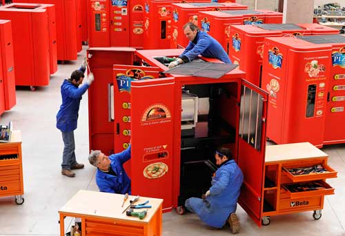 中新網(wǎng)3月27日電 據(jù)新加坡《聯(lián)合早報(bào)》報(bào)道,意大利一名企業(yè)家發(fā)明了比薩自動(dòng)販賣機(jī),人們只需付區(qū)區(qū)4.5美元,就能在3分鐘內(nèi)吃到熱騰騰的新鮮意大利比薩。