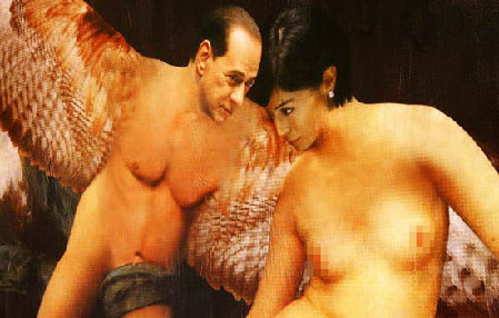 在潘塞卡的這幅作品中,貝盧斯科尼化身赤裸著身體的天使,用巨大的翅膀親昵地?fù)е獯罄麢C會平等事務(wù)部長瑪拉·卡爾法尼亞,含情脈脈地盯著自己的女部下。