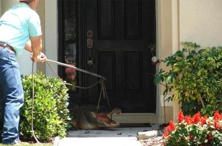 中新網(wǎng)4月29日電 據(jù)英國媒體報道,日前在佛羅里達州郊區(qū)的一家住戶門外驚現(xiàn)一條長達11英尺的鱷魚,這家主人被困屋內(nèi)緊急報警,野生動物專家用了一個小時才把這位“不速之客”請走。