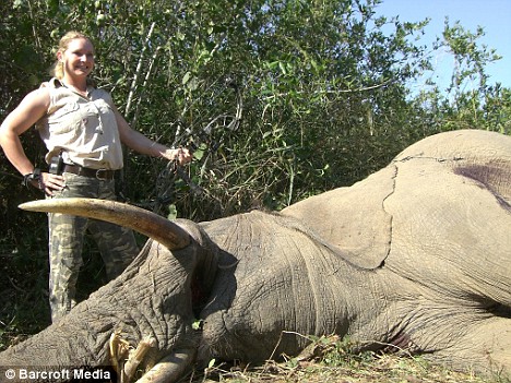 在Teressa一箭射倒大象后,并不敢馬上上前。她在旁邊守了整整一夜后才鼓足勇氣上前查看,發(fā)現(xiàn)大象確實(shí)已經(jīng)死亡。感到萬(wàn)分自豪的她,拿著自己所使用的弓箭與被射殺的大象合影留念。