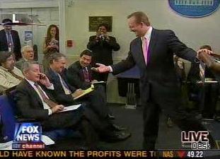 三家主要的有線電視臺(tái)都實(shí)況轉(zhuǎn)播了白宮新聞發(fā)布會(huì)!度耸隆冯s志記者約翰-吉茲的手機(jī)首先傳出鈴聲。吉布斯在聽到鈴聲后稱:“請(qǐng)放至震動(dòng),我們以前也是這樣作的!碑(dāng)手機(jī)再次發(fā)出聲音后,吉布斯走下講臺(tái),要求吉茲交出手機(jī),他隨后把手機(jī)扔給站在房間后面的一位助手。就在吉布斯回到講臺(tái),開始回答一個(gè)問題時(shí),美國(guó)哥倫比亞廣播公司記者比爾-普朗特的手機(jī)又響了起來。已負(fù)責(zé)報(bào)道白宮事務(wù)25年的普朗特拒絕了吉布斯交出手機(jī)的要求,他離開了房間,人們發(fā)出一陣笑聲,普朗特五分鐘后回到他的前排座位。
