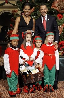 奧巴馬夫婦13日在圣誕晚會上開心地和小精靈們一一握手合照,美國總統(tǒng)夫人米歇爾還會在拍照時,要大家“看著所有的閃光燈,給攝影師一個笑容”,并且指導(dǎo)小朋友如何擺出一個完美的笑容。