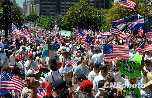 洛杉磯市墨西哥裔市長(zhǎng)維拉萊戈薩現(xiàn)身游行現(xiàn)場(chǎng),他以祖父從墨西哥移民美國(guó)的故事告訴大家追求美國(guó)夢(mèng)是每位移民的權(quán)利,他旗幟鮮明地反對(duì)亞利桑那州的新移民法,并呼吁聯(lián)邦政府加快移民改革步伐。美國(guó)國(guó)會(huì)華裔眾議員趙美心向數(shù)萬(wàn)民眾發(fā)表演說(shuō),“我們現(xiàn)在就要全面的移民改革!”趙美心等國(guó)會(huì)議員最近發(fā)起推動(dòng)的一項(xiàng)移民議案得到了絕大多數(shù)拉丁裔移民家庭的擁護(hù)。