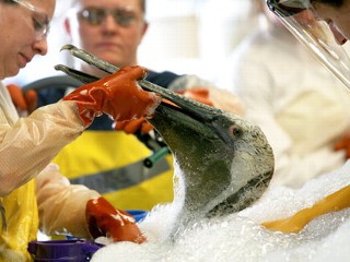 中新網(wǎng)6月9日電 據(jù)美國媒體報道,墨西哥灣漏油給當?shù)伉B類帶來致命影響,美國路易斯安那州的一間倉庫已被用來清洗被原油包裹得無法動彈的海鳥。志愿工作者穿著防毒護具,一遍又一遍擦洗海鳥身上的深色原油。