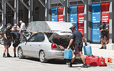 中新網(wǎng)6月26日電 據(jù)香港《文匯報(bào)》26日?qǐng)?bào)道,G20峰會(huì)前夕,各成員國領(lǐng)袖陸續(xù)抵,加拿大警方在多倫多市采取極嚴(yán)密保安措施。連日來已有3名可疑人士被捕,其中1名53歲男子前日駕車經(jīng)過峰會(huì)會(huì)場(chǎng)禁區(qū),由于車頂綁著1個(gè)鋼制儲(chǔ)物箱,模樣怪異,引起警方注意。警察攔車檢查,赫然發(fā)現(xiàn)車上有十字弓、電鋸、棒球棍、大錘外,還有多種不明液體。警方?jīng)]收這批物品,并將他拘捕。