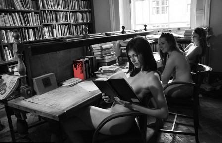 8月號(hào)的掛歷上,則是一組女學(xué)生在圖書館中讀書,她們巧用書本遮蓋自己的隱私處。