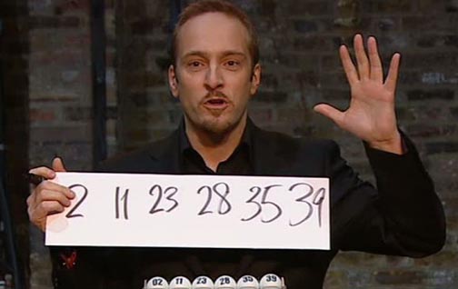 英國(guó)電視臺(tái)現(xiàn)場(chǎng)直播了當(dāng)期彩票的開獎(jiǎng)過程,由機(jī)器隨機(jī)選擇箱子中的球。而在另一個(gè)演播室,放置了一臺(tái)電視播放開獎(jiǎng)過程。這位身處另一演播室的神秘“幻術(shù)師”在結(jié)果出來(lái)之前,就背對(duì)電視寫下了一組數(shù)字,分別是2、11、23、28、35和39。結(jié)果證實(shí),他所預(yù)測(cè)的數(shù)字與中獎(jiǎng)結(jié)果完全一致,令人瞠目結(jié)舌。
