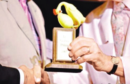 難得的是,雖然乍看之下得獎(jiǎng)似乎并不光彩,主辦單位也表示如果得獎(jiǎng)人覺得受辱,他們會(huì)撤銷提名。但事實(shí)上多數(shù)獲獎(jiǎng)?wù)叨己芨吲d,主辦方還會(huì)請(qǐng)來諾貝爾獎(jiǎng)得主擔(dān)任評(píng)委。比如去年諾貝爾經(jīng)濟(jì)獎(jiǎng)得主克魯格曼這次就獲邀出席。