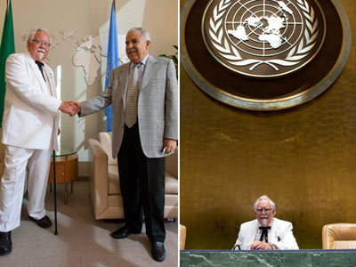這位名叫湯普森的男子一頭白發(fā),戴著眼鏡,身穿肯德基創(chuàng)始人桑德斯上校標(biāo)志性的白色西裝,打著黑色領(lǐng)結(jié),不知為何成功避開(kāi)了嚴(yán)密的安保措施,混進(jìn)位于美國(guó)紐約的聯(lián)合國(guó)總部大樓。他提出與聯(lián)合國(guó)大會(huì)新任主席、利比亞前外長(zhǎng)阿里.圖里基握手合影,得到了對(duì)方回應(yīng)。湯普森還成功地在聯(lián)大主會(huì)堂的聯(lián)合國(guó)徽標(biāo)下拍了多張照片,從照片上看,好像在開(kāi)會(huì)。