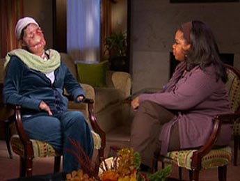 查拉-納什(Charla Nash)一現(xiàn)身節(jié)目,現(xiàn)場觀眾都非常震驚,即使見多識廣的歐普拉,也坦言從來沒見過這么可怕的面孔,就算是燒燙傷患者都沒有傷成這種程度──查拉這張臉,已沒有了眼睛、鼻子、嘴唇,甚至雙手也重殘,10個(gè)指頭全被咬斷。