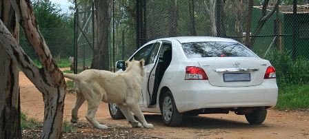 據(jù)報(bào)道,在南非約翰內(nèi)斯堡野生獅子動(dòng)物園,一輛白色豐田車的車主粗心大意,沒(méi)有按照?qǐng)@方叮囑鎖好車門,結(jié)果真的讓一頭獅子“盯上”了。這只重約136公斤的獅子走近汽車,用嘴來(lái)回摸索,竟然用牙齒咬住了車門的把手,將車輛左后方的車門拉開(kāi)了。而車主尚在車內(nèi),被嚇得一動(dòng)也不敢動(dòng),完全驚呆了,像是難以置信。