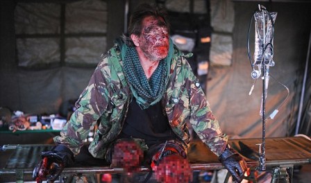 借助涂抹假血等化妝技術(shù),斯威夫特看上去就像是一名剛剛在爆炸中嚴(yán)重受傷的士兵。他雙腿齊刷刷地?cái)嗟,斷腿裹著的繃帶滲出血跡,周圍還掛著被炸爛的肉、皮,有的地方骨頭還露了出來(lái)。