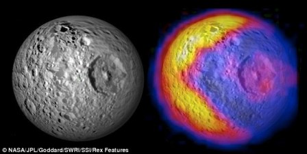 據(jù)報道,繞著土星軌道飛行的“卡西尼”號飛船近日拍下一幅關(guān)于土星的衛(wèi)星——土衛(wèi)一“米瑪斯”(Mimas)星球表面熱量分布的圖片,圖片顯示該衛(wèi)星熱量分布很不均勻。科學(xué)家認為,這是由于其表面構(gòu)成成分的差異所造成的。