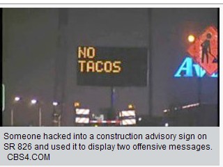 公路旁的電子廣告牌,應(yīng)該是提供交通信息,但邁阿密這條公路旁的廣告牌,卻出現(xiàn)了“不要拉美人士”、“不要玉米餅”的字樣,原來是這個廣告牌遭到黑客入侵,惡意竄改了顯示的的字樣。