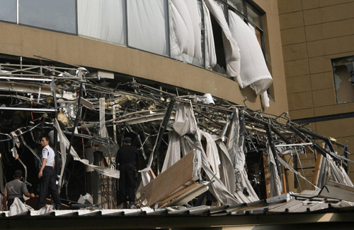 一位在麗思-卡爾頓酒店附近工作的目擊者看見酒店的一些窗戶被炸得粉碎,大部分都是低層的窗戶。酒店外墻受到嚴重損毀,窗戶玻璃炸至粉碎,大量碎片散落在人行道上,萬豪酒店則有煙冒出。據(jù)中國駐當?shù)厥桂^人員表示,南航駐當?shù)剞k公室距離萬豪酒店不過500米,玻璃被震碎。
