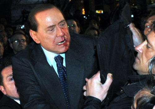 中新網(wǎng)12月14日電 當(dāng)?shù)貢r(shí)間13日,意大利總理貝盧斯科尼在米蘭市中心的米蘭大教堂附近參加一場(chǎng)政治集會(huì),發(fā)表完演講離開(kāi)時(shí)遭到一名中年的男子的襲擊。該男子隔著保鏢向他的右臉?lè)较蛉尤ヒ患匚,?dǎo)致其鼻骨輕微骨折,兩顆牙齒斷裂,嘴唇內(nèi)外也都受傷,需要在醫(yī)院接受24小時(shí)觀察,以及為期20天的治療。消息一出,舉世嘩然。