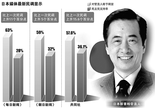 如果說(shuō)去年9月民主黨實(shí)現(xiàn)政權(quán)更迭是日本政治的歷史性轉(zhuǎn)折,那么今年6月民主黨再次組閣則是擺脫該黨頹勢(shì)的重要轉(zhuǎn)折。近日,日本多個(gè)民調(diào)顯示,民主黨的支持率正迅速大幅回升。