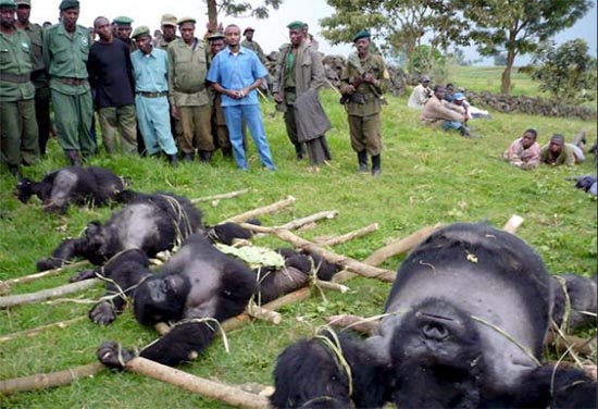 僅2007年6、7兩月就有7頭大猩猩被屠殺,而一頭名為Senkwekwe、重達(dá)500磅的銀背大猩猩的遇害照片更令村民們悲痛不已。除200只珍稀猩猩被殺害,森林砍伐加速,自然資源流失,更令人發(fā)指的是,過去10年共有150多名護(hù)林隊員在剛果民主共和國東部地區(qū)的五個公園中被謀殺。