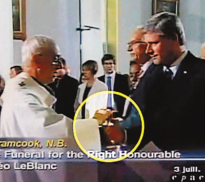 據(jù)香港文匯報(bào)報(bào)道,哈珀上周出席加拿大前總督勒布朗的天主教葬禮,流傳在YouTube上的電視畫面顯示:哈珀領(lǐng)了圣餐(見圖),但鏡頭停留的數(shù)秒鐘中,都沒有哈珀把圣餐餅放入嘴中的動(dòng)作。